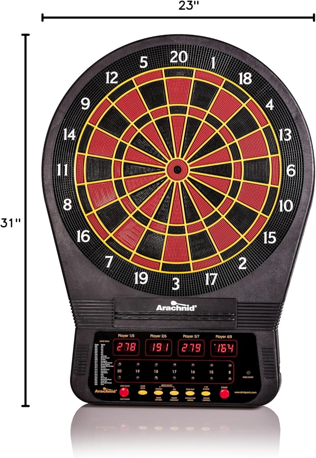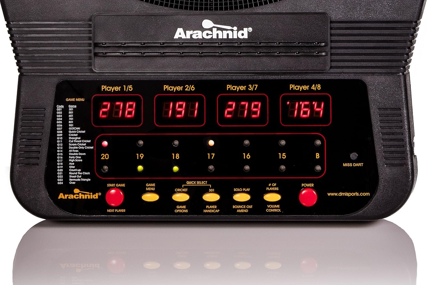 Up to 8 players with 2 sets of tricolor cricket LED displays. The ARACHNID trademark is a registered trademark owned by Arachnid 360 LLC and used by Escalade Sports pursuant to the license