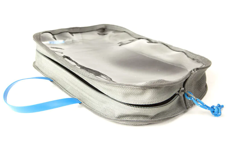 The Pouch has two blue zipper pulls that are easily located and a top rubberized carry handle for easy opening and transporting. The carry handle can be hung around most US door knobs for use when traveling. The top is transparent, allowing you to see the contents without opening the pouch. The inside is a loop field, allowing the installation of Dapper Loops for even more organization options.