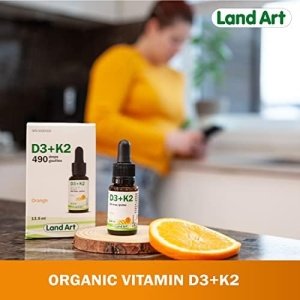 Land Art’s Certified Organic Vitamin D3+K2 is gluten free, vegetarian and preservative free! Our Vitamin D3+K2 drops are made with naturally sourced D3 vitamin derived from lanolin and natural vitamin K2-MK7 sourced from Natto. The D3+K2 vitamin is mixed with organic sunflower seed oil. Our D3+K2 vitamin product comes with a dropper to facilitate dosage. One drop contains 250 IU of vitamin D3 and 30 mcg of vitamin K2-MK7. Each bottle contains 490 drops.