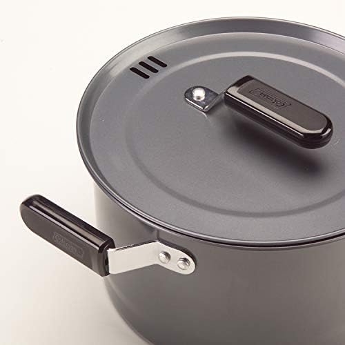 Designed for family camping adventures, the Coleman Family Cookware Set, 6-Piece, provides all the camping cookware needed to prepare hearty meals outdoors. This nesting cookware set includes a 10-inch frying pan that lets you fry eggs for breakfast, 2.4-quart saucepan with lid for heating up chili for lunch, and 6.9-quart stockpot/kettle to easily handle heating soups and boiling water. Cutout areas in the lids enable straining when making pasta dishes, while the textured grip handle provides a steady and comfortable hold. The included detachable handle fits both the frying pan and kettle, so you can move the camping cookware with comfort and ease. Built from commercial-grade steel, this set withstands high heat and also features riveted and plated handles and mounts for increased durability. The stainless steel cookware has nonstick surfaces that make this it quick and easy to clean when mealtime ends.