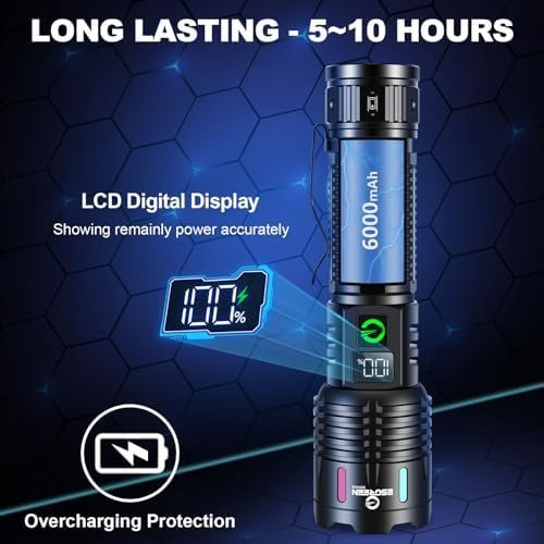 [LONG LASTING 10H & UPGRADED LCD DIGITAL POWER DISPLAY] The Esgreen high powered flashlight long beam is equipped with 1pcs 6000mAh rechargeable battery, so it can provide up to 10 hours of powerful and non-diminishing brightness. Both the battery and flashlight are built-in a smart chip that has the overcharging protection to ensure safety. The LCD power display shows remaining power exactly, you will get known when to charge it in advance.