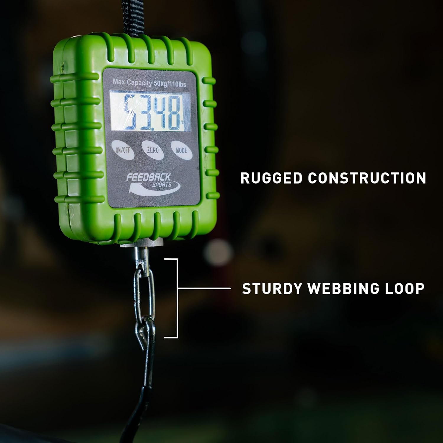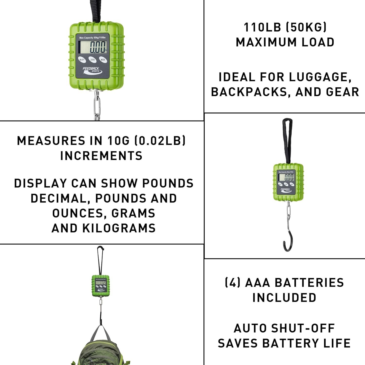 FEEDBACK SPORTS | Expedition Backpacking, Biking, Luggage 110lbs Capacity Digital Scale | Protective Rubber Exterior, Lbs/Kgs/Ounces/Grams/Decimal LCD Display | Batteries Included