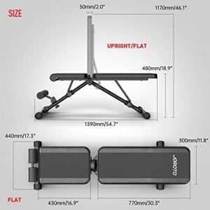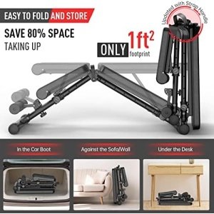 【Foldable & Save Space】 With the one-knob folding design, this foldable workout bench can be easily tucked away in storage when not in use to save space. After completing the workout, you can fold it and put it in a corner or under desk, saving more than 80% space and creating more accessibility in the room.