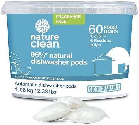 Nature Clean Dishwasher Pacs are high performing without the use of chlorine, phosphates, perfumes, dyes or animal by-products. This product is vegan, gluten-free, kosher, septic and grey water safe. Biodegradable and not tested on animals.Seeing Yellow Specs in Your Dish Pacs? Same Great Natural Cleaning Power Just a Different Colour!