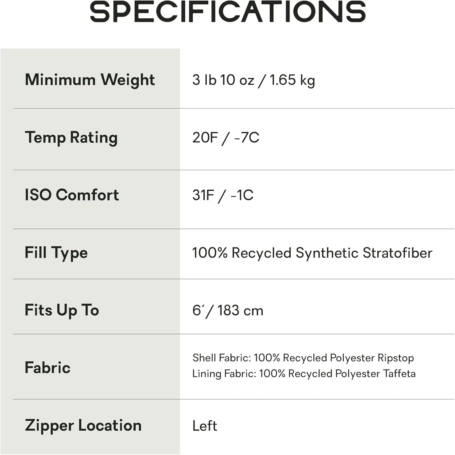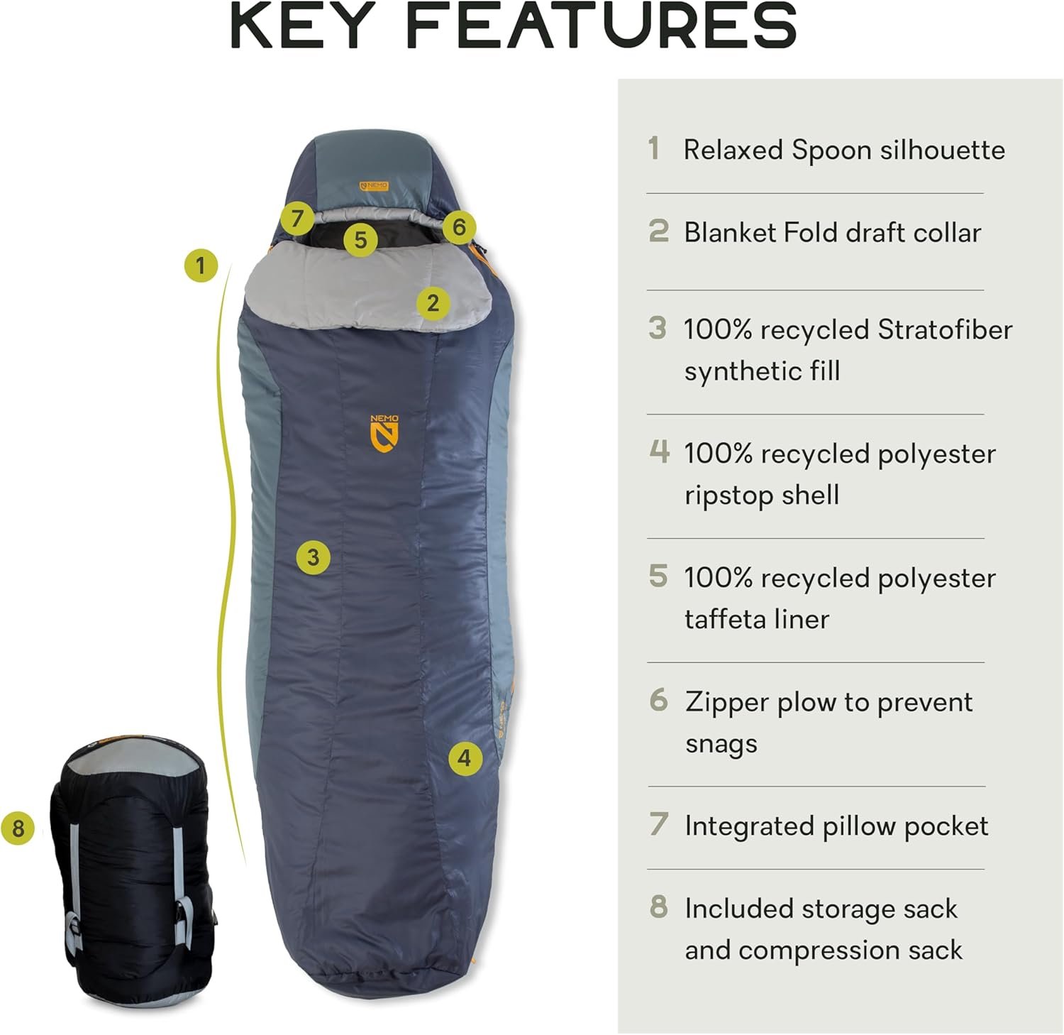 • Special Feature: {“Length”: [“Regular”]}, {“Temperature”: [“20u2109”]}, {“blanket foldu2122 external draft collar provides tucked-in comfort and temperature regulation”: [“Blanket Foldu2122 external draft collar provides tucked-in comfort and temperature regulation”]}, {“insulated with synthetic stratofiberu2122 fill , offering the best blend of warmth, moisture resistance, and packed volume”: [“Insulated with synthetic Stratofiberu2122 fill , offering the best blend of warmth, moisture resistance, and packed volume”]}, {“integrated pillow pocket allows a jacket, extra clothes, or fillou2122 to be stuffed in the sleeve opening for a handy pillow on-the-go”: [“Integrated pillow pocket allows a jacket, extra clothes, or Fillou2122 to be stuffed in the sleeve opening for a handy pillow on-the-go”]}, {“language_tag”: [“en”]}, {“manufacturer_part_number”: []}, {“patent # d804,780. patents pending”: [“Patent # D804,780. Patents pending”]}, {“protected by the nemo”: [“Protected by the NEMO”]}, {“rating_count”: []}, {“relaxed spoonu00ae shape for comfortable side sleeping”: [“Relaxed Spoonu00ae shape for comfortable side sleeping”]}, {“variant_options”: [{“Temperature”: [“20u2109”, “35u2109”], “Length”: [“Regular”, “Long”]}]}, {“zipper plow hardware for a snagless zip”: [“Zipper plow hardware for a snagless zip”]}, {“zippered stash pocket keeps your phone or other essentials warm and within reach”: [“Zippered stash pocket keeps your phone or other essentials warm and within reach”]} See more