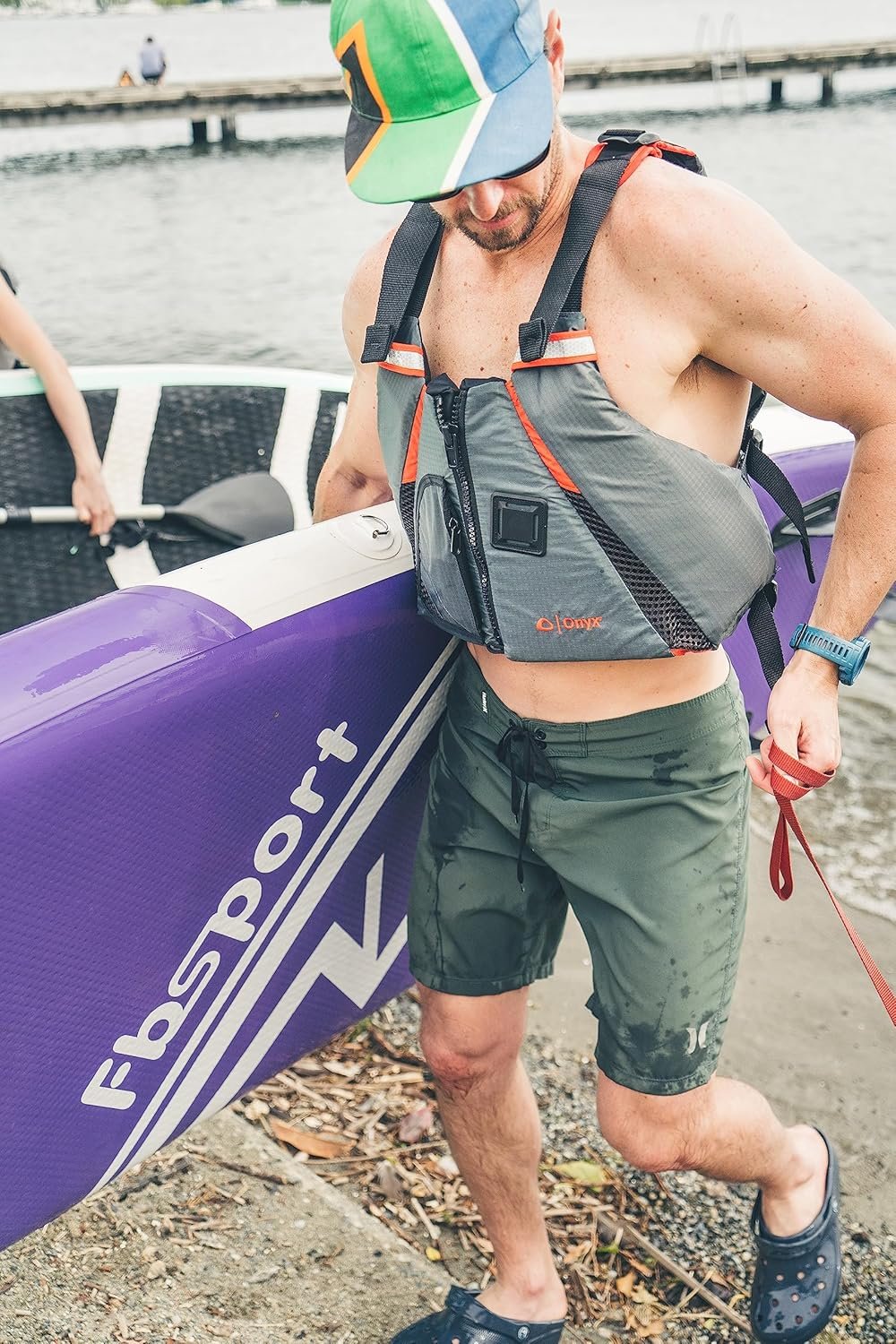 The Onyx MoveVent Dynamic Paddle Sports Life Vest and Pelican Sport Poseidon Angler Kayak Paddle 98.5-inch bundle is ideal for kayak anglers. The life vest features soft, lightweight flotation foam, mesh ventilation to keep cool, a whistle for safety, and reflective material for visibility. The 98.5-inch two-piece paddle has an anti-slip aluminum shaft and polypropylene blades for durability, an integrated hook retrieval system, measurement tape, ergonomic shape to reduce fatigue, and feathered 0/65° blades to optimize paddling. With flotation blocks to float if dropped and a push button system to set the feathered blades, this paddle complements the life vest to promote safe kayak fishing.