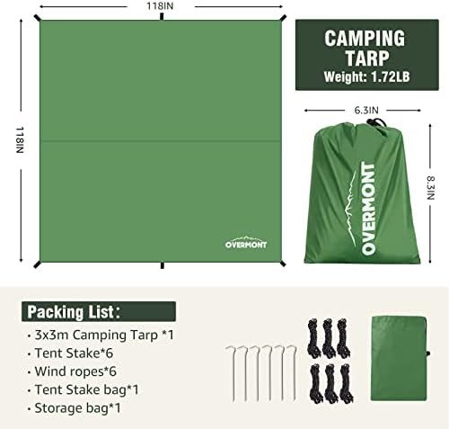 Package Contents: Overmont Tarp set includes a 3×3 m camping tarp * 1, storage bags * 2, tent pegs * 6, and ropes * 6. It comes with two storage bags of different sizes to organize and transport the tarp and small accessories.
