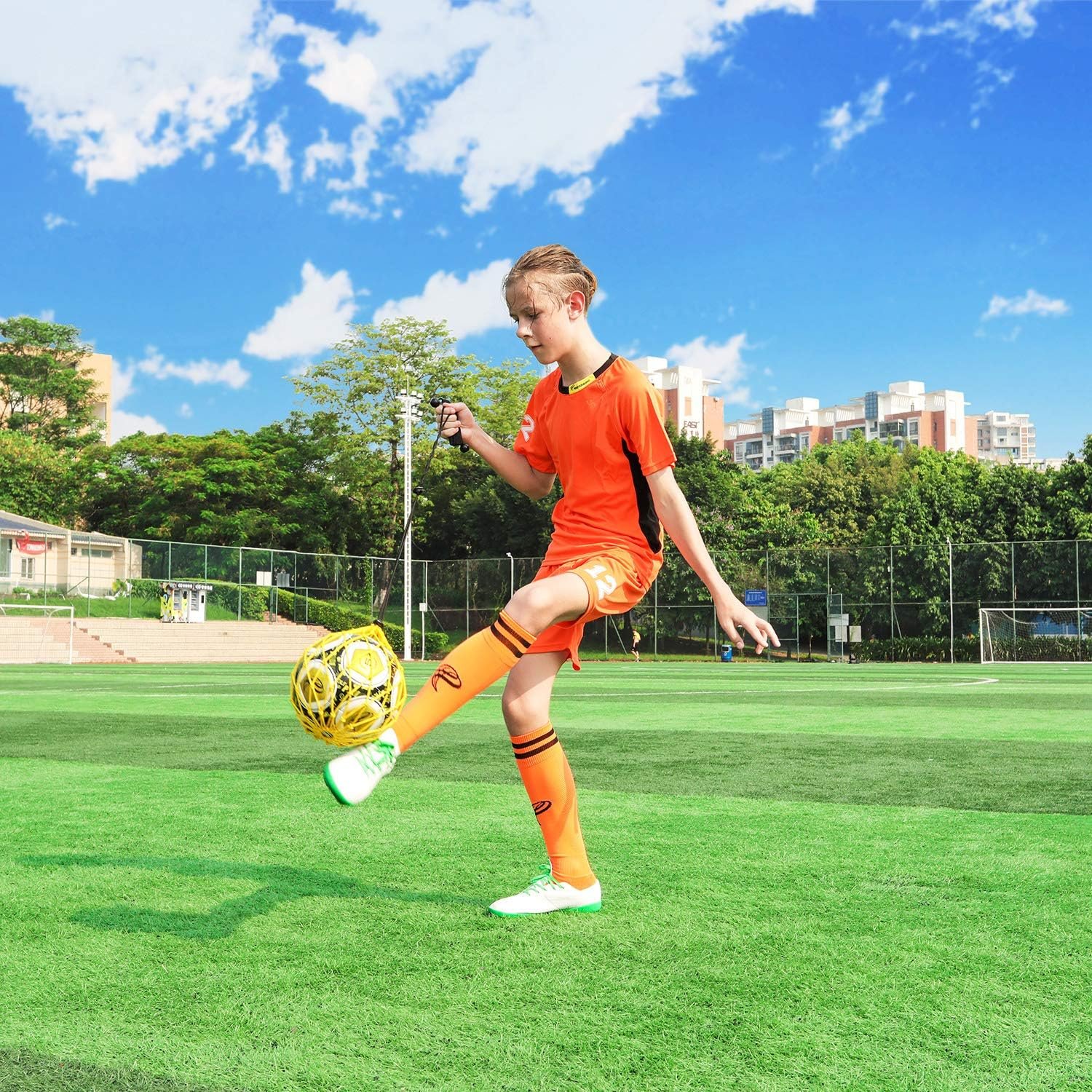 【MASTER BALL CONTROL】Practice with this soccer solo trainer, you shall never worry about ball control. You can easily master skills of kick-ups, juggling, and dribbling.