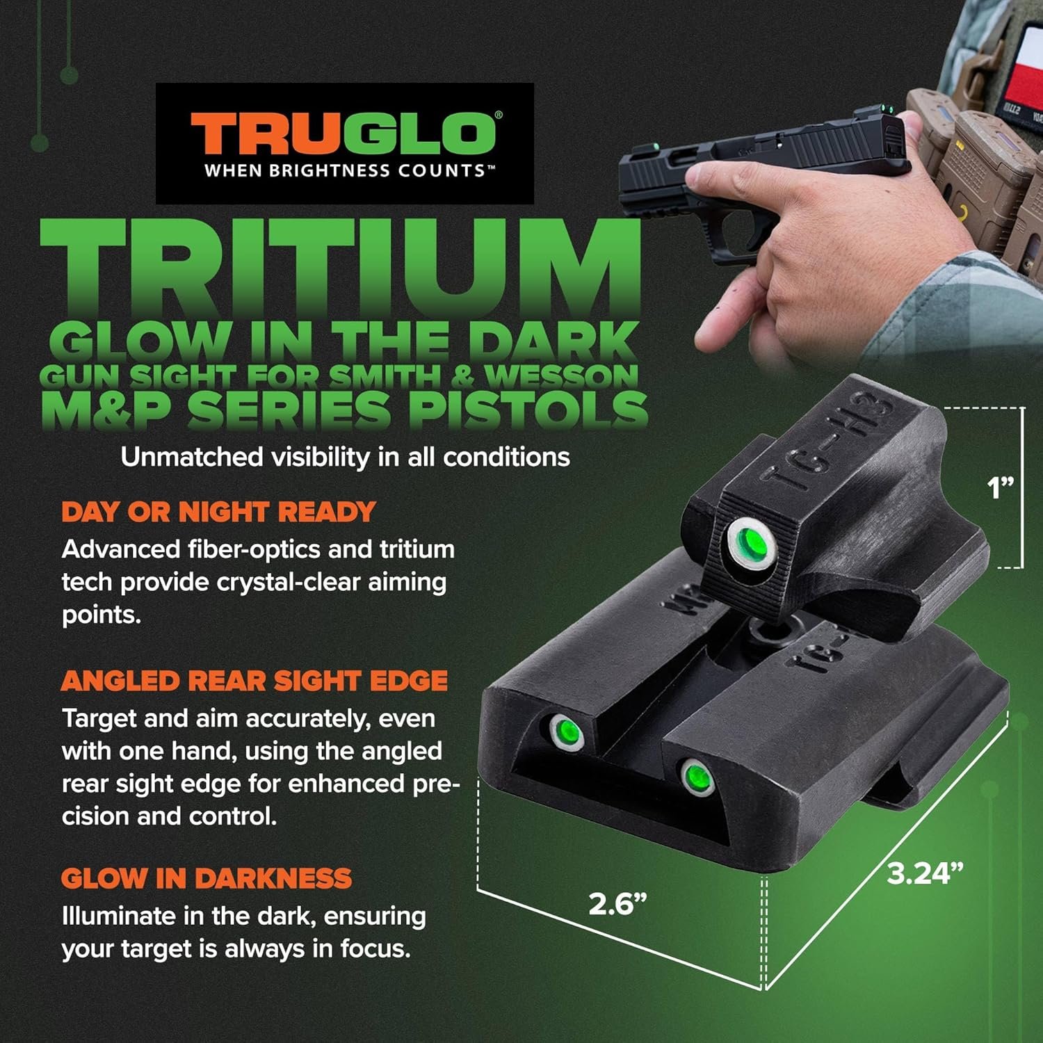 TruGlo Pistol Optic, Glow in the Dark Green/White Dot Sight for Smith & Wesson M&P Series Pistols, Tritium