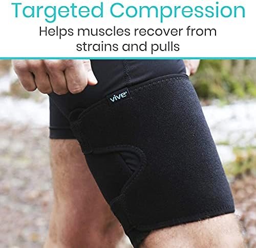 RELIEVES STIFF AND SORE MUSCLES: IncreStock numberg circulation and retaining therapeutic heat, the compression support wrap relieves stiff and sore thigh muscles. Effective for groin, hamstring and quad strains and pulls, the thigh support brace promotes healing, reduces recovery time and is useful in preventing re-injury.