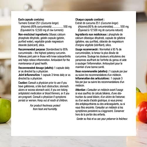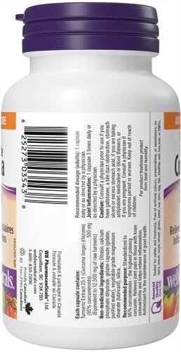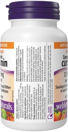 Extra Strength Turmeric Curcumin from Webber Naturals contains 500 mg of turmeric extract in every capsule, standardized to 95-Percent curcuminoids, one of turmeric’s active constituents. Turmeric is used in herbal medicine to help relieve joint inflammation and to provide antioxidant protection for the maintenance of good health.