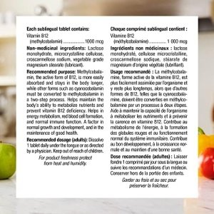 Vitamin B12 methylcobalamin from Webber Naturals is a one-per-day, higher potency, sublingual tablet providing 1000 mcg of the proactive form of vitamin B12 to help prevent and correct vitamin B12 deficiency. These fast-acting, Quick-Dissolve tablets support energy metabolism, immune function, and red blood cell formation, and are suitable for vegetarians.