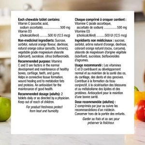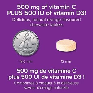 Chewable Vitamin C +D3 from Webber Naturals provides two essential nutrients in one great-tasting chewable tablet for immune support and healthy bones, cartilage, teeth, and gums. Each chewable tablet provides 500 mg of vitamin C and 500 IU of active vitamin D3 in a delicious natural orange flavour.