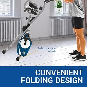 XTERRA FB350 Folding Bike The advanced folding frame design and multi-seating positions of the XTERRA Fitness FB350 Folding Bike maximizes your use of space while providing a workout that is comfortable and effective. With folded dimensions of only 20. 5” x 20” and built in transport wheels, it allows you to store it away when not in use and free up some valuable floor space. The padded lower back pad, large anatomically designed thick padded seat, and padded seat handles combine to give you a comfortable secondary seating position that will keep you working out longer. To ensure a smooth and sturdy workout, the FB350 utilizes our solid X-frame design with thick steel tubing and a silent belt drive system. Challenge yourself with 8 levels of resistance while you easily keep track of all of your workout data with the easy to use console. It provides feedback on your speed, distance, time, calories, and pulse along with a convenient scan feature. Make your workouts more effective by easily monitoring your heart rate with the handlebar mounted hand pulse sensors. For improved comfort and convenience, the FB350 features large multi-grip padded handlebars and an accessory holder for your remote control or phone. Start on the road to fitness today with the XTERRA Fitness FB350 Folding Bike and exceed your expectations. Features Solid X-frame design folds to just 20. 5” x 20” of floor space when not in use Padded lower back pad, large anatomically designed seat, and multi-grip padded handlebars are designed for long lasting comfort and support while also providing you with a comfortable secondary seating position Pulse grips in the handlebars allow you to closely monitor your heart rate at all times during your workout 2” x 1” LCD window is easy to read with all the necessary information – clearly displays speed, distance, time, calories, and pulse 8 levels of manual resistance are easily controlled through the large dial tension knob for users of all fitness levels Convenient accessory holder for your remote control or phone Adjustable strap foot pedals make your pedaling effort more effective while providing a secure non-slip surface 3. 3 lbs. precision balanced flywheel with friction-free magnetic resistance provides smooth, quiet, and maintenance free operation Console is powered by 2 AA batteries (included) – no electrical outlet needed Transport wheels allow for easily moving your equipment 3-piece pedal crank for added durability Weight limit: 225 lbs. Comfortably fits most users from 4’10” to 5’10” tall : 1-year frame and 90 days parts